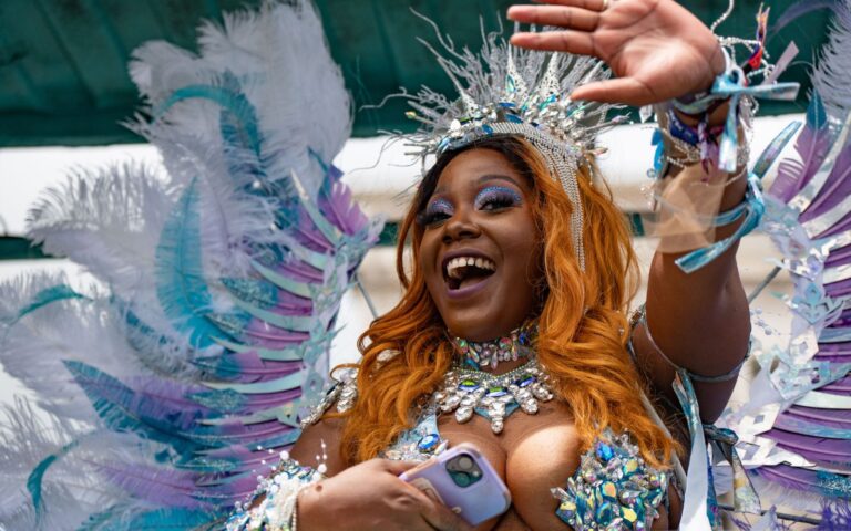 From our spot, it’s a living postcard. Glitter clings to sweaty skin. The scent of grilled fish drifts in from a nearby vendor. Spectators and masqueraders shout greetings as if everyone knows each other — and maybe here, they do.