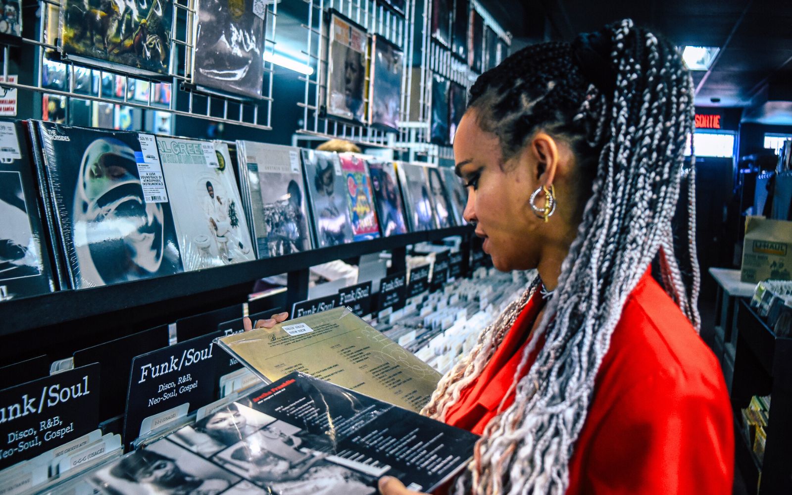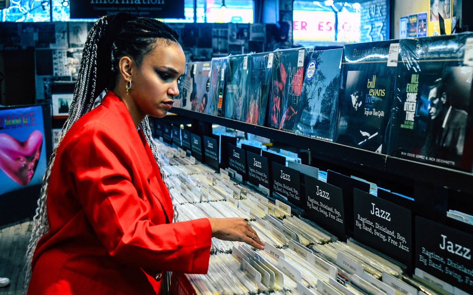 “OK, now I think we go to jazz,” Baldé says. We move to the front of the store and she begins flipping through the “Fs” in the ragtime, bop, free jazz, swing, and vocal jazz sections.