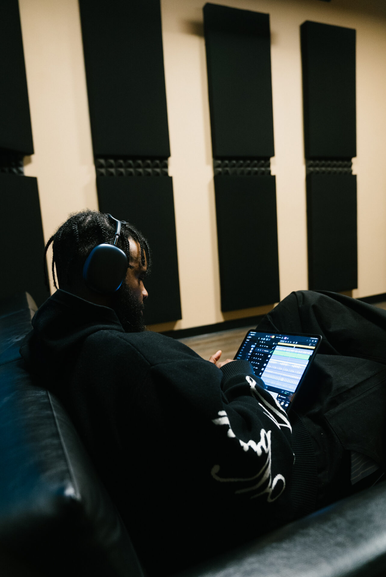 “I’m kind of always on the road. So I actually had to learn to work more mobile,” he says. “Since I started using the iPad and shit, and my laptop and my AirPods more, it’s my new thing. I can make beats on the go.”