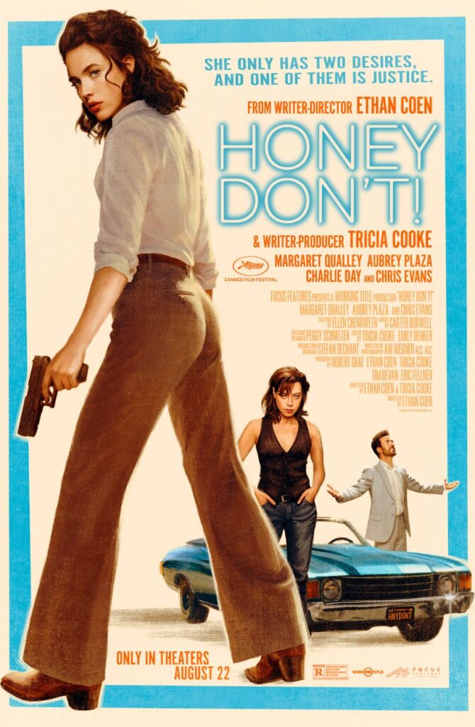 Taking place in a present-day Bakersfield that feels stuck in time—full of retro bars, cars, and sentiments—Honey Don’t!, follows private detective Honey O’Donahue (Margaret Qualley) as she investigates the death of a woman who asked for her help less than a day before her suspicious automobile accident. The trail quickly leads her to a religious cult run by the sexually deviant Reverend Drew Devlin (Chris Evans), a drug enterprise, and a sultry fling with police officer MG Falcone (Aubrey Plaza).
