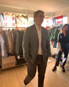 Phoenix, a vegan, couldn’t wear wool. When trying on the cotton blazer pictured, the Joker entered the room. The lapel brought a darkness out. “Something just switched on in him,” laughs Danabassis. “It was such a crisis.”