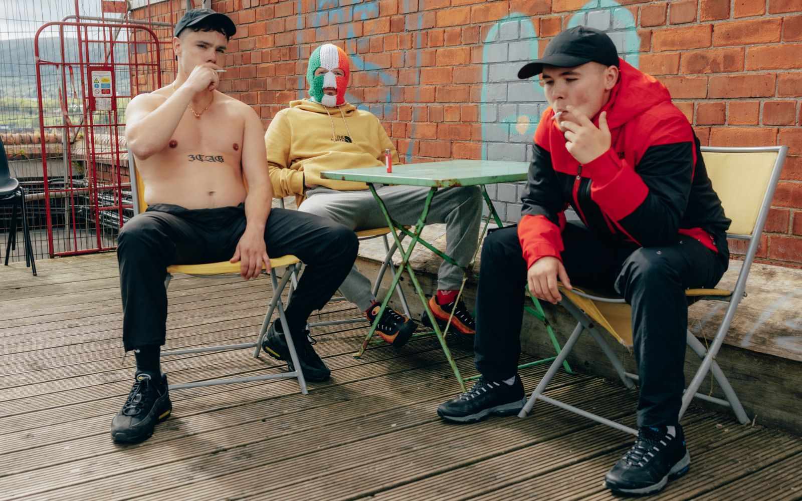 “We were writing these tracks for two years trying to work out something that we hadn’t done before, and that was in itself detrimental to actually writing music,” Chara says. “Toddla was trying to get us to look introspectively – ‘Talk about Ireland again, come back to yourselves, who is Kneecap, this is your debut album.’ Even though you probably feel like you’ve talked about yourselves plenty, welcome people into the Kneecap world for the first time.”