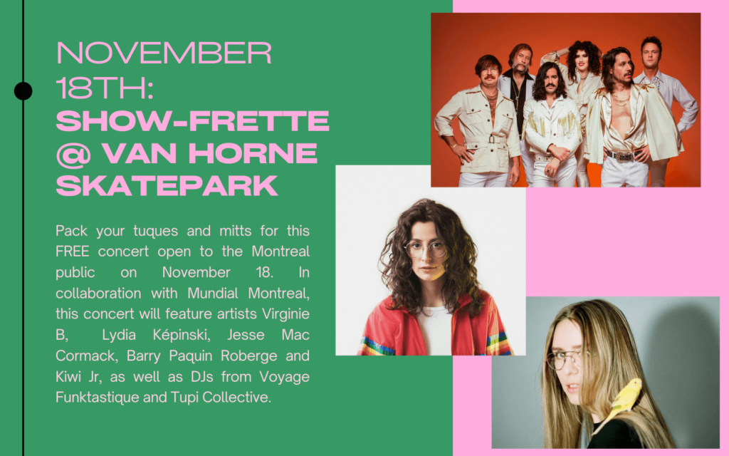 Bundle up for this free outdoor concert open to the Montreal public on November 18. In collaboration with Mundial Montreal, this concert will feature artists Virginie B, Lydia Képinski, Jesse Mac Cormack, Barry Paquin Roberge and Kiwi Jr, as well as DJs from Voyage Funktastique and Tupi Collective. | VAN HORNE SKATEPARK (5855 St Laurent Blvd.)