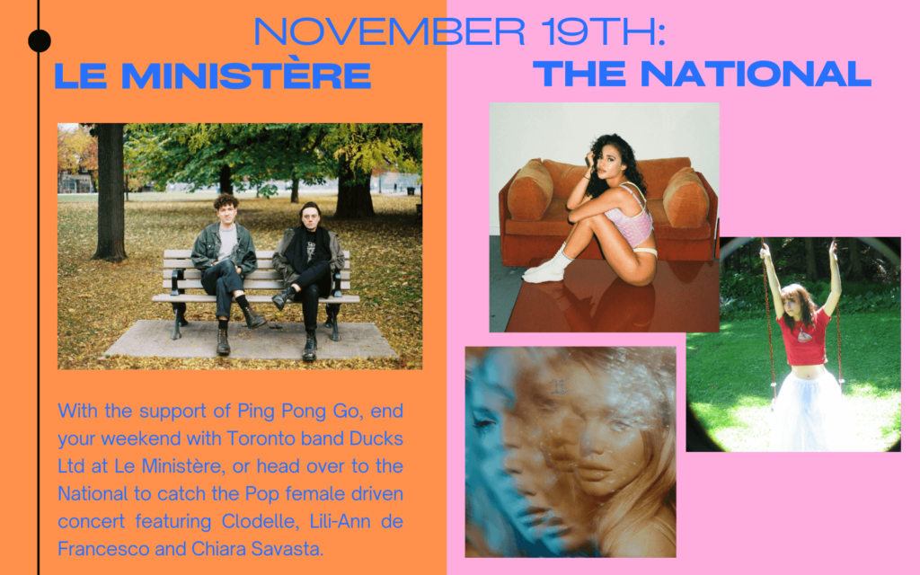 With the support of Ping Pong Go, end your weekend with Toronto band Ducks Ltd at Le Ministère, or head over to the National to catch the pop-forward female driven concert featuring Clodelle, Lili-Ann de Francesco and Chiara Savasta. | LE MINISTÈRE (4521 St Laurent Blvd.) & LE NATIONAL (1220 St Catherine St E)