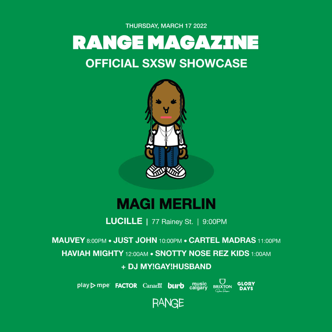 RANGE is excited to add Magi Merlin to the mix at our official SXSW showcase at this year on Thursday, March 17 alongside Snotty Nose Rez Kids, Haviah Mighty, Cartel Madras, Just John, and Mauvey.