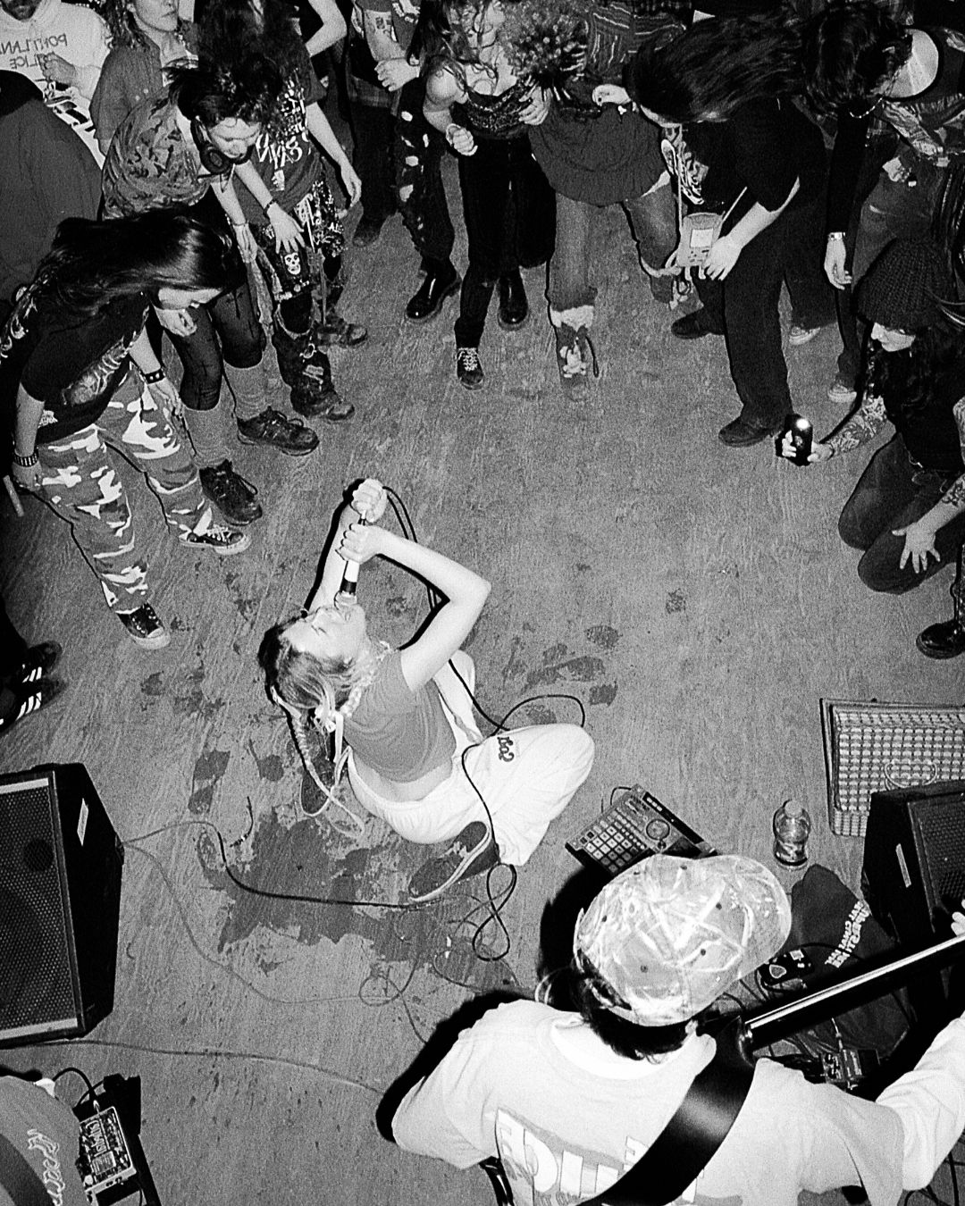 “I struggle with it. I don’t know how to manage it, or if I should. Firstly, I don’t want to tell anyone what to do with their bodies at our shows. Getting pushed or hit is very normal at hardcore shows, but it affects me deeply,” she says. “At the same time, hardcore spaces are a place where people can freely express anger, which is not something that’s available in the wild. I try to think about PISS as a way to call people in, to investigate what’s underneath that anger. We want people to feel free to do what they want, but to reflect on it, as it happens. That is what the character of the album is doing in their narrative arc.”