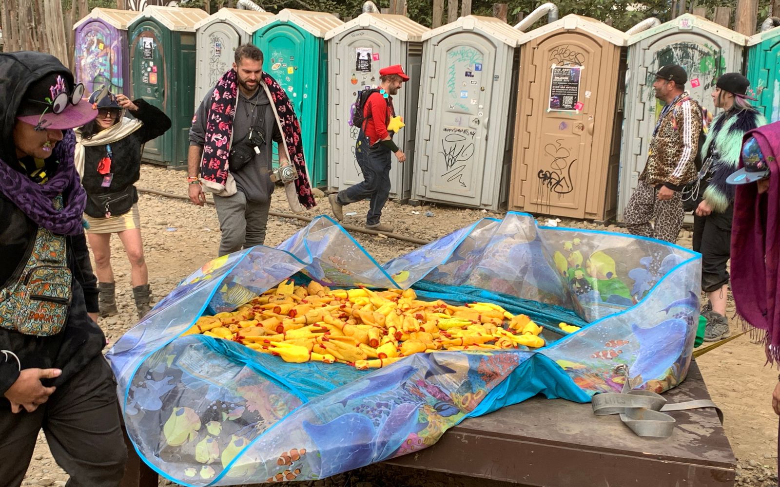 There was a noticeable amount of honks and squeaks on the farm this year and now we know why. As we made our way out of the Village around 5:00AM Monday morning, this coop was caught wheeling out a giant garbage bag full of rubber chickens. Whether or not this was a collection of cocks they farmed during the festival, or were brought in to gift to attendees, we will never know.